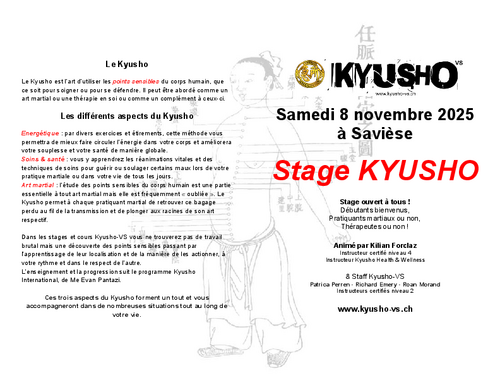 - Flyer de stage de Kyusho du 17 juin à Savièse. De 8h30 à 13h20, découvrez les différents aspects du Kyusho Energétique, martial et santé! au programme ensuite sortie du club qui débutera par un repas à la pizzeria des crêtes a Grimmisuat à 14h puis départ pour Saillon pour se ressourcer.